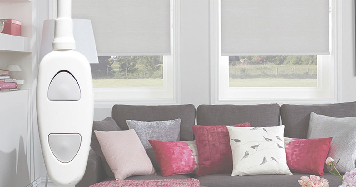 A truly innovative control option for Designer Roller Shades. Effortless, battery powered one touch wand operation that is easily operated: one touch to raise, one touch to lower and one touch to stop.